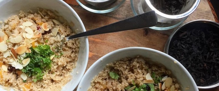Het werd een couscous met fruit en amandelen, die zowel warm als koud goed met deze thee gecombineerd kan worden.