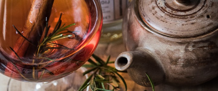 Daarna zeef je het en giet je het in een mooi hittebestendig glas en voeg een takje verse rozemarijn en een stokje ceylon kaneel toe.