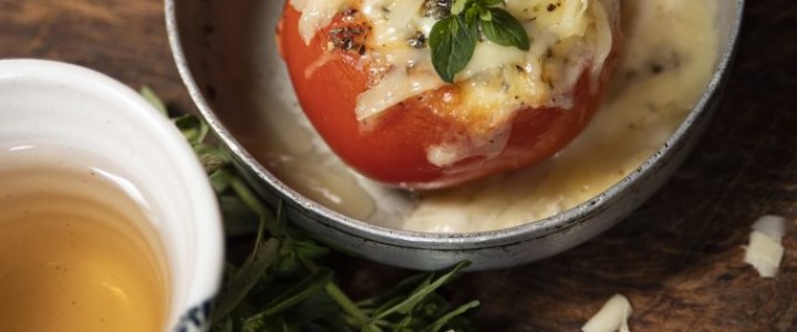 Plaats het ovenschaaltje met tomaat in een voorverwarmde oven op 180 graden en gaar hierin de gevulde tomaat voor 15-20 minuten.