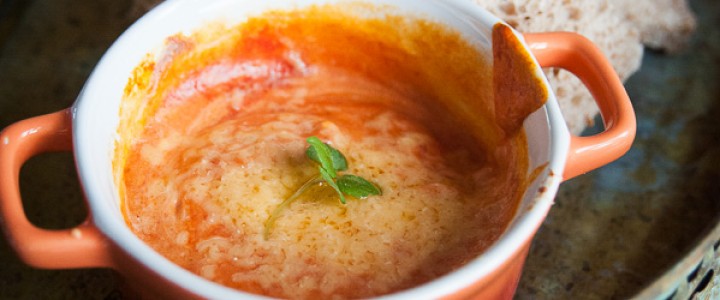 Neem een ovenschaaltje en doe daar kaas, tomatenpuree en kruiden in.