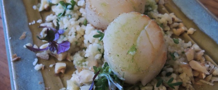 Eerst de couscous, daaroverheen wat gehakte noten, shiso en tuinkers.
