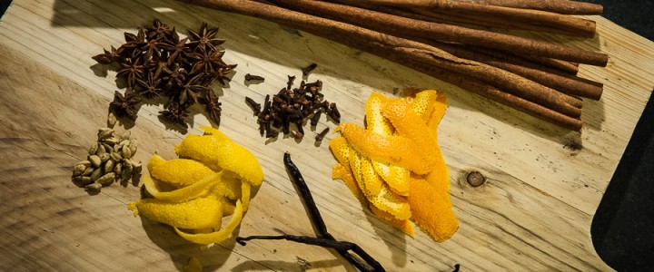 Voeg de bovengenoemde ingrediënten toe en laat dit al verwarmend in de wijn trekken voor zo’n 5 minuten. Let erop dat de wijn niet mag koken.